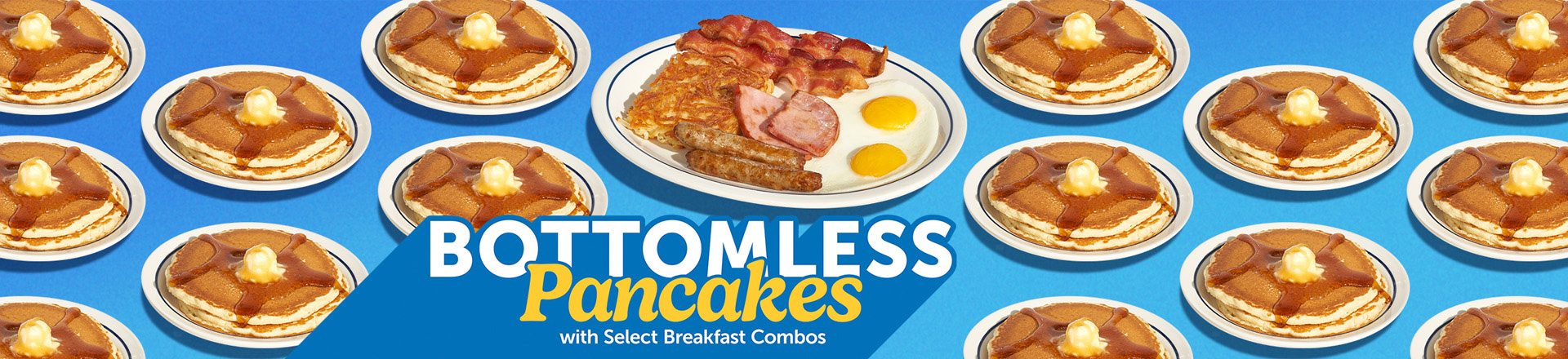 Two eggs, bacon, sausage, ham, hash browns and two buttermilk pancakes.